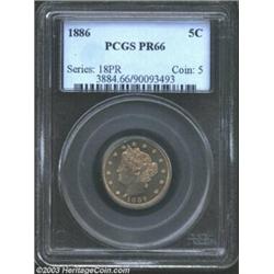<TR><TD width="100%"><TABLE cellSpacing=1 cellPadding=3 width="100%" border=0><TBODY><TR><TD width="100%" bgColor=#79735c><FONT face=arial color=#ffffff size=3><B>Description</B> </FONT></TD></TR><TR><TD width="100%" bgColor=#ffffff><FONT face=arial size=2><B>1886 5C PR66 PCGS.</B></I> Lovely golden-brown patina embraces this needle-sharp premium Gem. This key date example is pedigreed by a tiny planchet flaw (as made) in the field below the hair bun. The 86 in the date are lightly recut. Population: 66 in 66, 12 finer (4/03). </FONT></TD></TR></TBODY></TABLE></TD></TR></TBODY></TABLE><BR><A name=PricesRealized></A><TABLE cellSpacing=0 cellPadding=0 width="100%" bgColor=#000000 border=0><TBODY><TR><TD width="100%"><TABLE cellSpacing=1 cellPadding=3 width="100%" border=0><TBODY><TR><TD width="100%" bgColor=#79735c><A name=PR><FONT face=arial color=#ffffff size=3><B>Previous Prices from Heritage Auctions</B> </FONT></A></TD></TR><TR><TD bgColor=#f6f6ed><TABLE cellSpacing=0 cellPadding=0 width="100%" border=1><TBODY><TR><TD align=middle width="33%"><B>Date</B></TD><TD align=middle width="33%"><B>Service</B></TD><TD align=middle width="33%"><B>Price</B></TD></TR><TR bgColor=whitesmoke><TD width="33%"><B>03/23/2003</B></TD><TD width="33%">PCGS</TD><TD width="33%">$690.00</TD></TR><TR bgColor=whitesmoke><TD width="33%"><B>05/31/2001</B></TD><TD width="33%">PCGS</TD><TD width="33%">$632.50</TD></TR><TR bgColor=whitesmoke><TD width="33%"><B>09/18/1996</B></TD><TD width="33%">PCGS</TD><TD width="33%">$687.50</TD></TR><TR bgColor=whitesmoke><TD width="33%"><B>09/10/1997</B></TD><TD width="33%">PCGS</TD><TD width="33%">$814.00</TD></TR><TR bgColor=whitesmoke><TD width="33%"><B>08/02/1997</B></TD><TD width="33%">PCGS</TD><TD width="33%">$747.50</TD></TR><TR bgColor=whitesmoke><TD width="33%"><B>02/01/1999</B></TD><TD width="33%">PCGS</TD><TD width="33%">$687.00</TD></TR><TR bgColor=whitesmoke><TD width="33%"><B>03/01/2001</B></TD><TD width="33%">NGC</TD><TD width="33%">$690.00</TD></TR><TR bgColor=whitesmoke><TD width="33%"><B>03/01/1999</B></TD><TD width="33%">NGC</TD><TD width="33%">$633.00</TD></TR><TR bgColor=whitesmoke><TD width="33%"><B>05/01/1999</B></TD><TD width="33%">NGC</TD><TD width="33%">$863.00</TD></TR><TR bgColor=whitesmoke><TD width="33%"><B>02/22/1997</B></TD><TD width="33%">NGC</TD><TD width="33%">$632.50</TD></TR><TR bgColor=whitesmoke><TD width="33%"><B>11/01/1995</B></TD><TD width="33%">NGC</TD><TD width="33%">$688.00</TD></TR></TBODY></TABLE></TD></TR><TR><TD bgColor=#ffffff><FONT face=arial size=1 ?>PLEASE NOTE: All prices realized reflect the final hammer price PLUS the buyer's premium in auctions that charge a buyer's premium. Each item has a notation at the top of the listing indicating whether that lot included a buyer's premium. Example: A item that sells with a final hammer price of $100 and a 20% buyer's premium will display with a price realized of $120. All information listed is intended to be as accurate as possible, but errors are possible. Please use this guide carefully and inform us of any inaccuracies. </FONT></TD></TR></TBODY></TABLE></TD></TR></TBODY></TABLE><BR><TABLE cellSpacing=0 cellPadding=0 width="100%" bgColor=#000000 border=0><TBODY><TR><TD width="100%"><TABLE cellSpacing=1 cellPadding=3 width="100%" border=0><TBODY><TR><TD width="100%" bgColor=#79735c colSpan=6><FONT face=arial color=#ffffff size=3><B>Price Guide*</B> </FONT></TD></TR><TR bgColor=#f6f6ed><TD align=middle><B>Grade</B> </TD><TD align=middle><B>Coin World<BR>(Trends)</B> </TD><TD align=middle><B>Numismedia<BR>Retail</B> </TD><TD align=middle><B>Numismedia<BR>Wholesale</B> </TD><TD align=middle><B>Coin<BR>Universe</B> </TD><TD align=middle><B>Heritage<BR>Value Index</B> </TD></TR><TR bgColor=#ffffff><TD align=middle>65</TD><TD align=right>---</TD><TD align=right>$690.00</TD><TD align=right>$550.00</TD><TD align=right>$600.00</TD><TD align=right>$420.83</TD></TR><TR style="FONT-WEIGHT: bold" bgColor=#cccfdd><TD align=middle>66</TD><TD align=right>---</TD><TD align=right>---</TD><TD align=right>$845.00</TD><TD align=right>$1,025.00</TD><TD align=right>$671.25</TD></TR><TR bgColor=#ffffff><TD align=middle>67</TD><TD align=right>---</TD><TD align=right>---</TD><TD align=right>$1,840.00</TD><TD align=right>$2,200.00</TD><TD align=right>$1,540.00</TD></TR><TR bgColor=#ffffff><TD colSpan=6><FONT size=1>*All information listed is intended to be as accurate as possible, but errors are possible. No item may be returned or refused based on this information which is provided as a service to our customers. You should contact each pricing source directly to determine the accuracy of this information. </FONT></TD></TR></TBODY></TABLE></TD></TR></TBODY></TABLE><BR><TABLE cellSpacing=0 cellPadding=0 width="100%" bgColor=#000000 border=0><TBODY><TR><TD width="100%"><TABLE cellSpacing=1 cellPadding=3 width="100%" border=0><TBODY><TR><TD width="100%" bgColor=#79735c><FONT face=arial color=#ffffff size=3><B>Population Guide</B> </FONT></TD></TR><TR bgColor=#ffffff><TD align=middle><!-- Begin Output of Population Grid--><TABLE cellSpacing=0 cellPadding=0 width="100%" border=0><TBODY><TR><TD vAlign=center><TABLE cellSpacing=0 width="100%" border=1 cellsadding="3"><TBODY><TR><TD vAlign=center><TABLE cellSpacing=0 cellPadding=3 width="100%" border=1><TBODY><TR><TD vAlign=center align=middle bgColor=#f0f1e8 colSpan=2 <CENTER><FONT face=Arial size=2><B>PCGS Pop </B></FONT><CENTER></CENTER></TD><TD vAlign=center align=middle bgColor=#f0f1e8 colSpan=2><CENTER><FONT face=Arial size=2><B>NGC Pop</B></CENTER></FONT></TD></TR><TR><TD vAlign=center><FONT face=Arial size=2>(66)</FONT> </TD><TD vAlign=center align=right><FONT face=Arial size=2>66</FONT> </TD><TD vAlign=center><FONT face=Arial size=2>(66)</FONT> </TD><TD vAlign=center align=right><FONT face=Arial size=2>98</FONT> </TD></TR><TR><TD vAlign=center><FONT face=Arial size=2>(>66)</FONT> </TD><TD vAlign=center align=right><FONT face=Arial size=2>12</FONT> </TD><TD