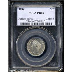 <TABLE cellSpacing=0 cellPadding=0 width="100%" bgColor=#000000 border=0><TBODY><TR><TD width="100%"><TABLE cellSpacing=1 cellPadding=3 width="100%" border=0><TBODY><TR><TD width="100%" bgColor=#79735c><FONT face=arial color=#ffffff size=3><B>Description</B> </FONT></TD></TR><TR><TD width="100%" bgColor=#ffffff><FONT face=arial size=2><B>1886 5C PR66 PCGS.</B></I> Fully struck with a coating of lovely pastel colors on each side, which prevents the proof fields from seeming fully reflective. The 86 in the date is lightly repunched.There is a curly lintmark (as struck) directly before Liberty's throat, and a tiny pinpoint-sized contact mark resides just below and behind the base of her portrait. Population: 66 in 66, 13 finer (8/03). </FONT></TD></TR></TBODY></TABLE></TD></TR></TBODY></TABLE><BR><A name=PricesRealized></A><TABLE cellSpacing=0 cellPadding=0 width="100%" bgColor=#000000 border=0><TBODY><TR><TD width="100%"><TABLE cellSpacing=1 cellPadding=3 width="100%" border=0><TBODY><TR><TD width="100%" bgColor=#79735c><A name=PR><FONT face=arial color=#ffffff size=3><B>Previous Prices from Heritage Auctions</B> </FONT></A></TD></TR><TR><TD bgColor=#f6f6ed><TABLE cellSpacing=0 cellPadding=0 width="100%" border=1><TBODY><TR><TD align=middle width="33%"><B>Date</B></TD><TD align=middle width="33%"><B>Service</B></TD><TD align=middle width="33%"><B>Price</B></TD></TR><TR bgColor=whitesmoke><TD width="33%"><B>11/23/2002</B></TD><TD width="33%">PCGS</TD><TD width="33%">$691.15</TD></TR><TR bgColor=whitesmoke><TD width="33%"><B>05/31/2001</B></TD><TD width="33%">PCGS</TD><TD width="33%">$632.50</TD></TR><TR bgColor=whitesmoke><TD width="33%"><B>06/06/1998</B></TD><TD width="33%">PCGS</TD><TD width="33%">$862.50</TD></TR><TR bgColor=whitesmoke><TD width="33%"><B>09/18/1996</B></TD><TD width="33%">PCGS</TD><TD width="33%">$687.50</TD></TR><TR bgColor=whitesmoke><TD width="33%"><B>03/04/1994</B></TD><TD width="33%">PCGS</TD><TD width="33%">$742.50</TD></TR><TR bgColor=whitesmoke><TD width="33%"><B>09/10/1997</B></TD><TD width="33%">PCGS</TD><TD width="33%">$814.00</TD></TR><TR bgColor=whitesmoke><TD width="33%"><B>08/13/1999</B></TD><TD width="33%">PCGS</TD><TD width="33%">$891.25</TD></TR><TR bgColor=whitesmoke><TD width="33%"><B>08/02/1997</B></TD><TD width="33%">PCGS</TD><TD width="33%">$747.50</TD></TR><TR bgColor=whitesmoke><TD width="33%"><B>03/01/2001</B></TD><TD width="33%">NGC</TD><TD width="33%">$690.00</TD></TR><TR bgColor=whitesmoke><TD width="33%"><B>03/01/1999</B></TD><TD width="33%">NGC</TD><TD width="33%">$748.00</TD></TR><TR bgColor=whitesmoke><TD width="33%"><B>03/01/1999</B></TD><TD width="33%">NGC</TD><TD width="33%">$633.00</TD></TR><TR bgColor=whitesmoke><TD width="33%"><B>05/01/1999</B></TD><TD width="33%">NGC</TD><TD width="33%">$633.00</TD></TR><TR bgColor=whitesmoke><TD width="33%"><B>05/01/1999</B></TD><TD width="33%">NGC</TD><TD width="33%">$863.00</TD></TR><TR bgColor=whitesmoke><TD width="33%"><B>08/01/1999</B></TD><TD width="33%">NGC</TD><TD width="33%">$575.00</TD></TR><TR bgColor=whitesmoke><TD width="33%"><B>03/23/2003</B></TD><TD width="33%">PCGS</TD><TD width="33%">$690.00</TD></TR><TR bgColor=whitesmoke><TD width="33%"><B>07/29/2003</B></TD><TD width="33%">PCGS</TD><TD width="33%">$661.25</TD></TR><TR bgColor=whitesmoke><TD width="33%"><B>06/01/1998</B></TD><TD width="33%">PCGS</TD><TD width="33%">$753.00</TD></TR><TR bgColor=whitesmoke><TD width="33%"><B>02/01/1999</B></TD><TD width="33%">PCGS</TD><TD width="33%">$687.00</TD></TR><TR bgColor=whitesmoke><TD width="33%"><B>09/01/1998</B></TD><TD width="33%">PCGS</TD><TD width="33%">$747.00</TD></TR><TR bgColor=whitesmoke><TD width="33%"><B>02/22/1997</B></TD><TD width="33%">NGC</TD><TD width="33%">$632.50</TD></TR><TR bgColor=whitesmoke><TD width="33%"><B>08/01/1999</B></TD><TD width="33%">NGC</TD><TD width="33%">$552.00</TD></TR><TR bgColor=whitesmoke><TD width="33%"><B>11/01/1995</B></TD><TD width="33%">NGC</TD><TD width="33%">$688.00</TD></TR></TBODY></TABLE></TD></TR><TR><TD bgColor=#ffffff><FONT face=arial size=1 ?>PLEASE NOTE: All prices realized reflect the final hammer price PLUS the buyer's premium in auctions that charge a buyer's premium. Each item has a notation at the top of the listing indicating whether that lot included a buyer's premium. Example: A item that sells with a final hammer price of $100 and a 20% buyer's premium will display with a price realized of $120. All information listed is intended to be as accurate as possible, but errors are possible. Please use this guide carefully and inform us of any inaccuracies. </FONT></TD></TR></TBODY></TABLE></TD></TR></TBODY></TABLE><BR><TABLE cellSpacing=0 cellPadding=0 width="100%" bgColor=#000000 border=0><TBODY><TR><TD width="100%"><TABLE cellSpacing=1 cellPadding=3 width="100%" border=0><TBODY><TR><TD width="100%" bgColor=#79735c colSpan=6><FONT face=arial color=#ffffff size=3><B>Price Guide*</B> </FONT></TD></TR><TR bgColor=#f6f6ed><TD align=middle><B>Grade</B> </TD><TD align=middle><B>Coin World<BR>(Trends)</B> </TD><TD align=middle><B>Numismedia<BR>Retail</B> </TD><TD align=middle><B>Numismedia<BR>Wholesale</B> </TD><TD align=middle><B>Coin<BR>Universe</B> </TD><TD align=middle><B>Heritage<BR>Value Index</B> </TD></TR><TR bgColor=#ffffff><TD align=middle>65</TD><TD align=right>---</TD><TD align=right>$690.00</TD><TD align=right>$550.00</TD><TD align=right>$600.00</TD><TD align=right>$420.83</TD></TR><TR style="FONT-WEIGHT: bold" bgColor=#cccfdd><TD align=middle>66</TD><TD align=right>---</TD><TD align=right>---</TD><TD align=right>$845.00</TD><TD align=right>$1,025.00</TD><TD align=right>$671.25</TD></TR><TR bgColor=#ffffff><TD align=middle>67</TD><TD align=right>---</TD><TD align=right>---</TD><TD align=right>$1,840.00</TD><TD align=right>$2,400.00</TD><TD align=right>$1,680.00</TD></TR><TR bgColor=#ffffff><TD colSpan=6><FONT size=1>*All information listed is intended to be as accurate as possible, but errors are possible. No item may be re