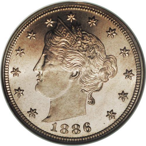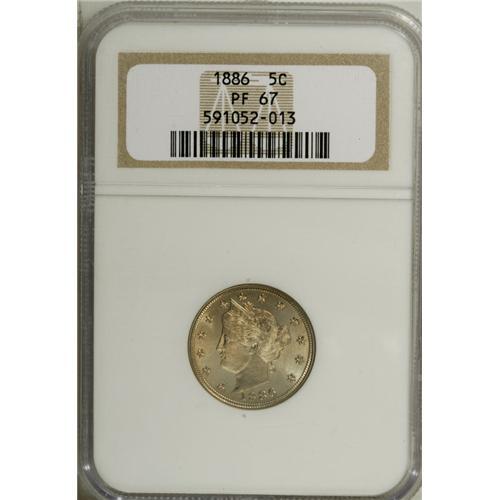 <B>1886 5C PR67 NGC.</B></I> One of 4,290 examples coined for this year, this 1886 nickel is among the best-preserved survivors for this year, which faces extra demand due to the low mintage of its business-strike counterpart. Boldly impressed with lemon-yellow and orange patina over reflective surfaces, and tied for the finest certified by either NGC or PCGS (12/06).<BR><I>From The Paul Vine Collection.</B></I><BR><BR><b>Shipping:</b> Coin/Currency (<a target="_blank" href="http://www.heritageauctions.com/common/shipping.php">view shipping information</a>)