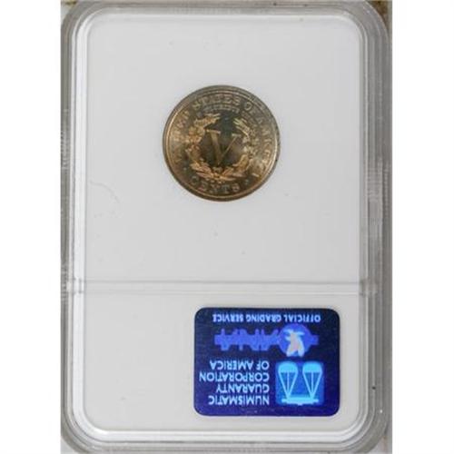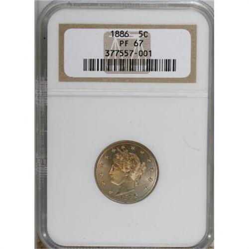 <B>1886 5C PR67 NGC.</B></I> Business strikes of this date are elusive, especially in the highest grades, thus Superb Gem proof examples are highly desired as a more affordable alternative for many collectors. Sharp design details and rich proof luster are evident through a thin veil of golden toning. Census: 16 in 67, 0 finer (8/07).<BR><BR><B>Coin Engraver:</B> Charles E. Barber<BR><BR><b>Shipping:</b> Coins & Currency (<a target="_blank" href="http://www.heritageauctions.com/common/shipping.php">view shipping information</a>)
