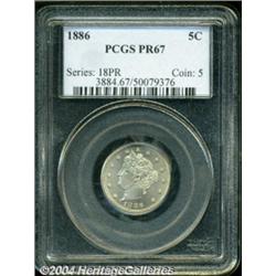 <table><tbody><tr><td><table> <TR><TD width="100%"><TABLE cellSpacing=1 cellPadding=3 width="100%" border=0><TBODY><TR><TD width="100%" bgColor=#79735c><FONT face=arial color=#ffffff size=3><B>Description</B> </FONT></TD></TR><TR><TD width="100%" bgColor=#ffffff><FONT face=arial size=2><B>1886 5C PR67 PCGS.</B></I> The low mintage and low availability of business strikes of this date adds date pressure to 1886 proof nickels that is out of line with a coin that saw 4,290 pieces struck. This is a shallowly mirrored example that shows pinpoint striking details and light, pearl-gray surfaces overall. Free from any distracting contact marks. Population: 13 in 67, 0 finer (10/03). </FONT></TD></TR></TBODY></TABLE></TD></TR></TBODY></TABLE><BR><A name=PricesRealized></A><TABLE cellSpacing=0 cellPadding=0 width="100%" bgColor=#000000 border=0><TBODY><TR><TD width="100%"><TABLE cellSpacing=1 cellPadding=3 width="100%" border=0><TBODY><TR><TD width="100%" bgColor=#79735c><A name=PR><FONT face=arial color=#ffffff size=3><B>Previous Prices from Heritage Auctions</B> </FONT></A></TD></TR><TR><TD bgColor=#f6f6ed><TABLE cellSpacing=0 cellPadding=0 width="100%" border=1><TBODY><TR><TD align=middle width="33%"><B>Date</B></TD><TD align=middle width="33%"><B>Service</B></TD><TD align=middle width="33%"><B>Price</B></TD></TR><TR bgColor=whitesmoke><TD width="33%"><B>08/07/2000</B></TD><TD width="33%">PCGS</TD><TD width="33%">$1,667.50</TD></TR><TR bgColor=whitesmoke><TD width="33%"><B>03/01/1999</B></TD><TD width="33%">NGC</TD><TD width="33%">$2,415.00</TD></TR><TR bgColor=whitesmoke><TD width="33%"><B>08/01/1999</B></TD><TD width="33%">NGC</TD><TD width="33%">$1,610.00</TD></TR><TR bgColor=whitesmoke><TD width="33%"><B>08/01/1999</B></TD><TD width="33%">PCGS</TD><TD width="33%">$2,128.00</TD></TR></TBODY></TABLE></TD></TR><TR><TD bgColor=#ffffff><FONT face=arial size=1 ?>PLEASE NOTE: All prices realized reflect the final hammer price PLUS the buyer's premium in auctions that charge a buyer's premium. Each item has a notation at the top of the listing indicating whether that lot included a buyer's premium. Example: A item that sells with a final hammer price of $100 and a 20% buyer's premium will display with a price realized of $120. All information listed is intended to be as accurate as possible, but errors are possible. Please use this guide carefully and inform us of any inaccuracies. </FONT></TD></TR></TBODY></TABLE></TD></TR></TBODY></TABLE><BR><TABLE cellSpacing=0 cellPadding=0 width="100%" bgColor=#000000 border=0><TBODY><TR><TD width="100%"><TABLE cellSpacing=1 cellPadding=3 width="100%" border=0><TBODY><TR><TD width="100%" bgColor=#79735c colSpan=6><FONT face=arial color=#ffffff size=3><B>Price Guide*</B> </FONT></TD></TR><TR bgColor=#f6f6ed><TD align=middle><B>Grade</B> </TD><TD align=middle><B>Coin World<BR>(Trends)</B> </TD><TD align=middle><B>Numismedia<BR>Retail</B> </TD><TD align=middle><B>Numismedia<BR>Wholesale</B> </TD><TD align=middle><B>Coin<BR>Universe</B> </TD><TD align=middle><B>Heritage<BR>Value Index</B> </TD></TR><TR bgColor=#ffffff><TD align=middle>66</TD><TD align=right>---</TD><TD align=right>---</TD><TD align=right>$845.00</TD><TD align=right>$1,025.00</TD><TD align=right>$746.88</TD></TR><TR style="FONT-WEIGHT: bold" bgColor=#cccfdd><TD align=middle>67</TD><TD align=right>---</TD><TD align=right>---</TD><TD align=right>$1,840.00</TD><TD align=right>$2,400.00</TD><TD align=right>$1,680.00</TD></TR><TR bgColor=#ffffff><TD align=middle>68</TD><TD align=right>---</TD><TD align=right>---</TD><TD align=right>---</TD><TD align=right>---</TD><TD align=right>---</TD></TR><TR bgColor=#ffffff><TD colSpan=6><FONT size=1>*All information listed is intended to be as accurate as possible, but errors are possible. No item may be returned or refused based on this information which is provided as a service to our customers. You should contact each pricing source directly to determine the accuracy of this information. </FONT></TD></TR></TBODY></TABLE></TD></TR></TBODY></TABLE><BR><TABLE cellSpacing=0 cellPadding=0 width="100%" bgColor=#000000 border=0><TBODY><TR><TD width="100%"><TABLE cellSpacing=1 cellPadding=3 width="100%" border=0><TBODY><TR><TD width="100%" bgColor=#79735c><FONT face=arial color=#ffffff size=3><B>Population Guide</B> </FONT></TD></TR><TR bgColor=#ffffff><TD align=middle><!-- Begin Output of Population Grid--><TABLE cellSpacing=0 cellPadding=0 width="100%" border=0><TBODY><TR><TD vAlign=center><TABLE cellSpacing=0 width="100%" border=1 cellsadding="3"><TBODY><TR><TD vAlign=center><TABLE cellSpacing=0 cellPadding=3 width="100%" border=1><TBODY><TR><TD vAlign=center align=middle bgColor=#f0f1e8 colSpan=2 <CENTER><FONT face=Arial size=2><B>PCGS Pop </B></FONT><CENTER></CENTER></TD><TD vAlign=center align=middle bgColor=#f0f1e8 colSpan=2><CENTER><FONT face=Arial size=2><B>NGC Pop</B></CENTER></FONT></TD></TR><TR><TD vAlign=center><FONT face=Arial size=2>(67)</FONT> </TD><TD vAlign=center align=right><FONT face=Arial size=2>13</FONT> </TD><TD vAlign=center><FONT face=Arial size=2>(67)</FONT> </TD><TD vAlign=center align=right><FONT face=Arial size=2>13</FONT> </TD></TR><TR><TD vAlign=center><FONT face=Arial size=2>(>67)</FONT> </TD><TD vAlign=center align=right><FONT face=Arial size=2>0</FONT> </TD><TD vAlign=center><FONT face=Arial size=2>(>67)</FONT> </TD><TD vAlign=center align=right><FONT face=Arial size=2>0</FONT> </TD></TR></TBODY></TABLE></TD></TR></TBODY></TABLE></TD></TR></TBODY></TABLE><!-- End Output of Population Grid--></TD></TR></TBODY></TABLE></TD></TR></TBODY></TABLE><BR><TABLE cellSpacing=0 cellPadding=0 width="100%" bgColor=#000000 border=0><TBODY><TR> <font color='#000000'><span style='background-color: #FFFFFF'><td bgcolor='#FFFFFE'> Important notice: Heritage usually auctions material at the rate of 200-250 lots per hour. On some occasions eBay Live bid software or the Internet may not be able to keep up with the pace of the auction. We recommend placing a