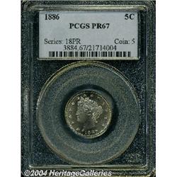 <B>1886<5C> PR67 PCGS.</B></I> The low mintage and low availability of business strikes of this date adds date pressure to 1886 proof Nickels that is out of line with a coin that saw 4,290 pieces struck. This is a shallowly mirrored example that shows pinpoint striking details and light, ice-blue surfaces overall. Free from any distracting contact marks. Population: 15 in 67, 0 finer (9/04). <BR><BR><B>Important notice:</B> Heritage usually auctions material at the rate of 200-250 lots per hour. On some occasions eBay Live bid software or the Internet may not be able to keep up with the pace of the auction. We recommend placing a realistic absentee bid now as insurance to avoid disappointment. Occasionally the auctioneer may eliminate or reject an eBay Live bid, and the auctioneer may also reopen a lot after the close of the eBay live bidding (usually because we missed an audience bid), and may reject your bid even if it shows you as the winning bidder. By bidding via eBay Live, you agree that Heritage may award the lot to another bidder at its sole discretion under the circumstances described above or any other reasonable circumstances. Since eBay bids are not shown to us until we open the lot on the floor, we treat those bids just like floor bids. In most cases the floor responds before the eBay bid is presented to us, due to Internet lag time, so for consistency we have made it a policy that floor bids are always considered first over tie eBay live bids. Also please note that all Heritage lots purchased through eBay Live carry a 20% Buyer's Premium. Please make sure you read the Terms and Conditions before you bid.