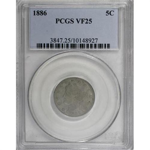 <B>1886 5C VF25 PCGS.</B></I> LIBERTY is bold, as are all other legends. The forehead curls display expected wear. The reverse has a few freckles of orange patina. A popular low mintage issue.<BR><BR><B>Coin Engraver:</B> Charles E. Barber<BR><BR><b>Shipping:</b> Coins & Currency (<a target="_blank" href="http://www.heritageauctions.com/common/shipping.php">view shipping information</a>)