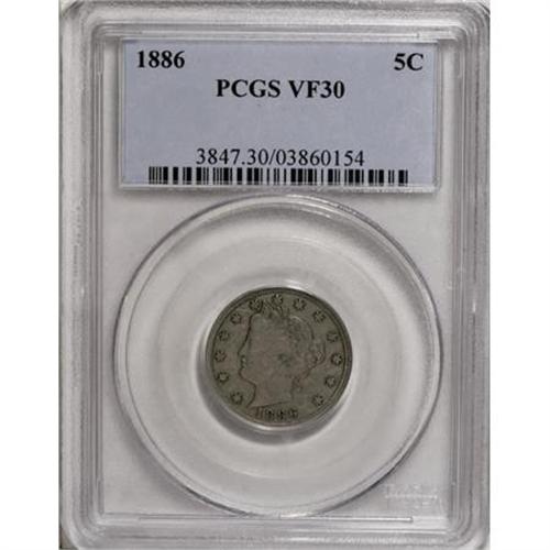 <B>1886 5C VF30 PCGS.</B></I> PCGS Population (12/324). NGC Census: (9/221). Mintage: 3,330,290. Numismedia Wsl. Price for NGC/PCGS coin in VF30: $491. (#3847)<BR><BR><B>Coin Engraver:</B> Charles E. Barber<BR><BR><b>Shipping:</b> Coins & Currency (<a target="_blank" href="http://www.heritageauctions.com/common/shipping.php">view shipping information</a>)