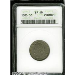 <B>1886 5C XF40 ANACS.</B></I> Softly detailed and typically worn, for the grade, with a few superficial, scattered surface blemishes. This key date example has pale olive-gray color over both sides.