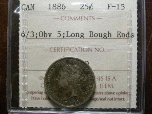 1886 "6 over 3" obverse 5 Long bough 25¢ ICCS F15. Popular variety!