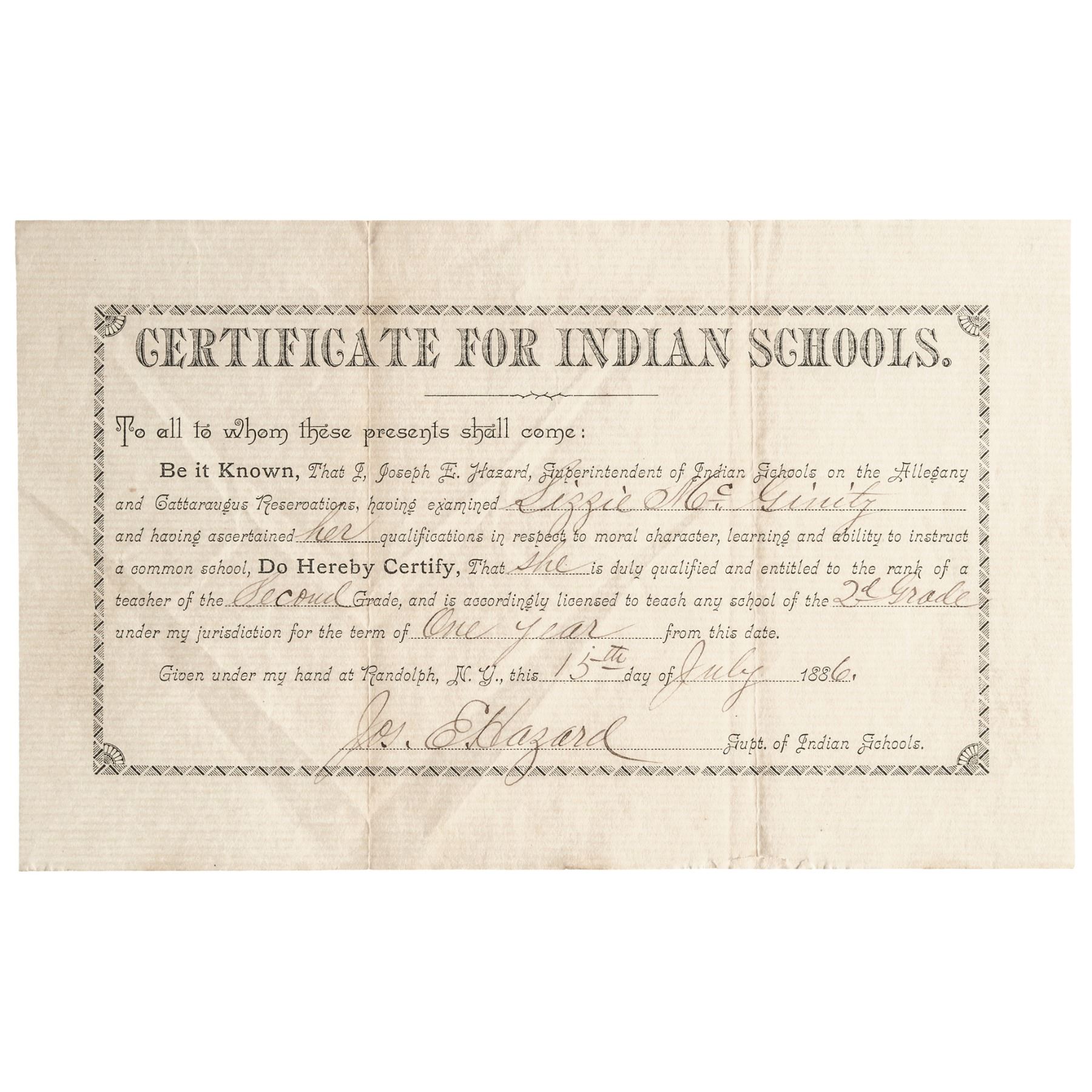 July 15, 1886, “CERTIFICATE FOR INDIAN SCHOOLS” Signed “Jos. E. Hazard,” Randolph, NY, Extremely Fine.