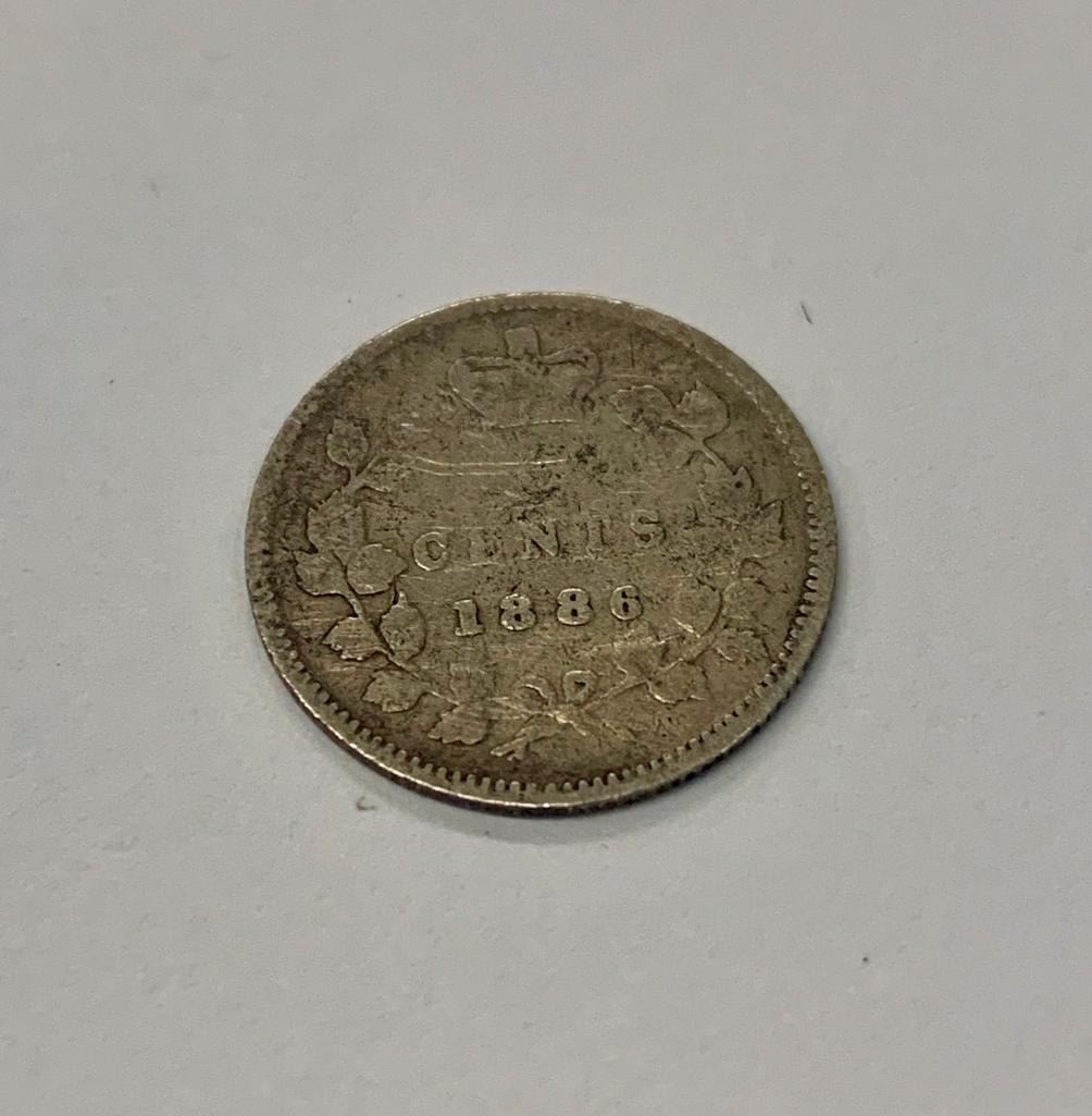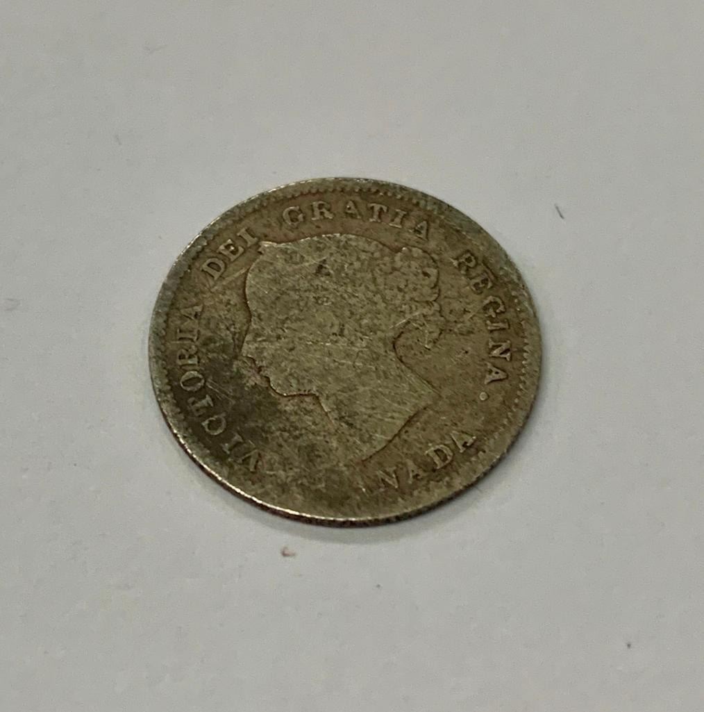 Obverse The portrait in left profile of Victoria is surrounded with the inscriptions "CANADA" and "VICTORIA DEI GRATIA REGINA" (Victoria, Queen by the grace of God) Lettering:  VICTORIA DEI GRATIA REGINA. CANADA Reverse The facial value is surrounded with two maple boughs and the crown of Queen Victoria Lettering:  5 CENTS 1858 Features  TypeStandard circulation coin Years1858-1901 Value5 Cents (0.05 CAD) MetalSilver (.925) Weight1.167 g Diameter15.494 mm Thickness0.70 mm ShapeRound OrientationCoin alignment ??