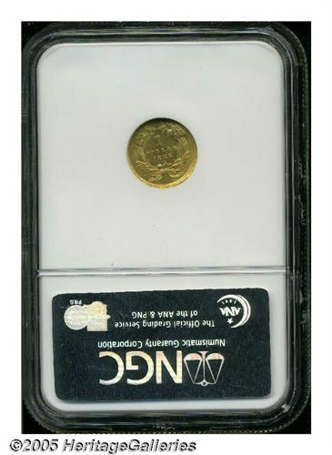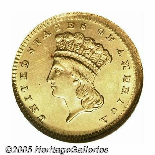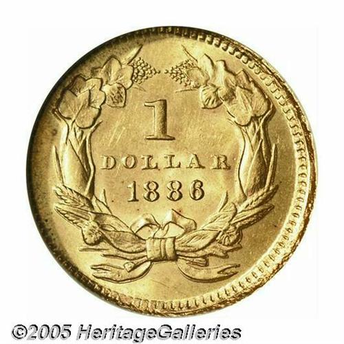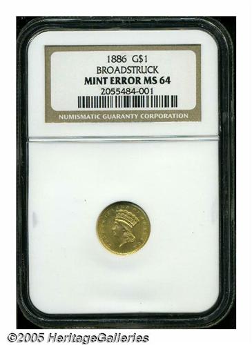 <B>1886<G$1> Gold Dollar--Broadstruck--MS64 NGC.</B></I> In searching our archives for broadstruck gold coins, the only listing we could find was for a 1906-D Double Eagle sold back in 2003. Needless to say, such errors are highly unusual for anything struck in gold. What makes this spectacular offering even more intriguing is that only 5,000 business strikes were produced in 1886, so the odds of an error slipping through are only more miniscule. This out-of-collar striking is shifted toward 8 o'clock and displays vibrant luster.