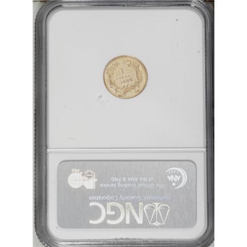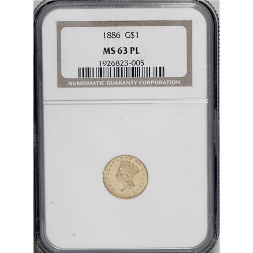 <B>1886<G$1> MS63 Prooflike NGC.</B></I> Despite its low mintage of 5,000 pieces, the 1886 is tied with one other issue for the greatest number of examples certified as Prooflike. This piece has reflective, lightly abraded honey-gold fields and sharp devices. Census: 6 in 63 Prooflike, 11 finer (9/06).