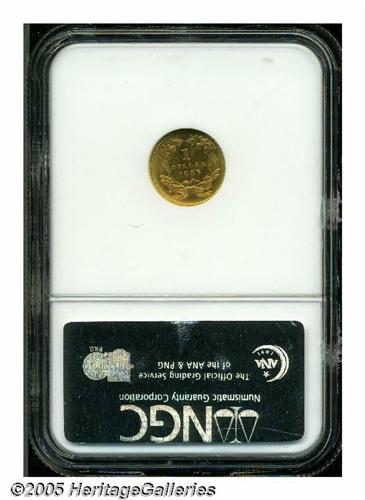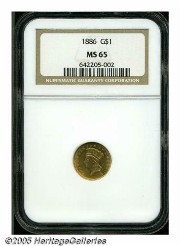 <B>1886<G$1> MS65 NGC.</B></I> The 1886 Gold Dollar was not as widely hoarded as some of the other low mintage dates from the 1880s and is far more difficult in better Mint State grades. This sharp, deep golden-orange example is imbued with lime-green accents. The design features are adequately struck, and the well preserved surfaces are devoid of significant marks. Only 5,000 business strikes were produced, and NGC and PCGS have certified only 52 specimens at this grade level, with 42 higher (4/05).
