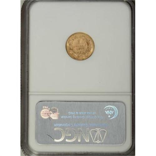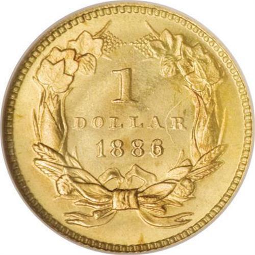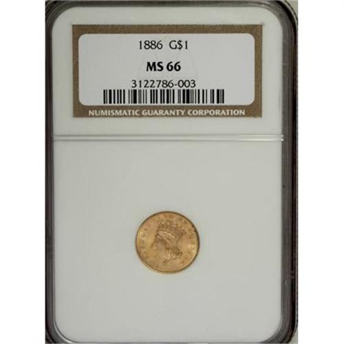 <B>1886 G$1 MS66 NGC.</B></I> A fair number of 1886 gold dollars are available through the MS64 grade level, but the population thins out above that. Swirling luster adorns yellow-gold surfaces that exhibit impressively struck devices. Well preserved, with a light alloy spot or two on each side, along with faint clash marks. Census: 16 in 66, 11 finer (3/08).<BR><BR><B>Coin Engraver:</B> James B. Longacre<BR><BR><b>Shipping:</b> Coins & Currency (<a target="_blank" href="http://www.heritageauctions.com/common/shipping.php">view shipping information</a>)