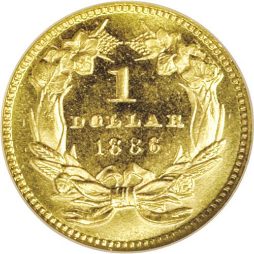 <B>1886 G$1 MS66 Prooflike NGC.</B></I> Gorgeous bright brass-gold surfaces jump out at the viewer, and the design elements are bold and frosty, yielding excellent field-motif contrast. There are no noticeable marks to report on this outstanding 1886 Premium Gem gold dollar. The reverse is rotated a few degrees counterclockwise. Census: 3 in 66 Prooflike, 3 finer (10/06).<BR><BR><b>Shipping:</b> Coin/Currency (<a target="_blank" href="http://www.heritageauctions.com/common/shipping.php">view shipping information</a>)
