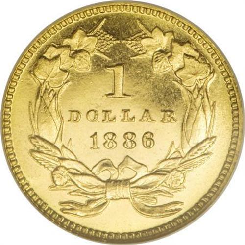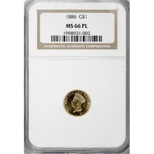 <B>1886 G$1 MS66 Prooflike NGC.</B></I> Bright, gorgeous and flashy brass-gold surfaces leap out at the viewer. The design elements are bold and frosty, yielding excellent contrast between the fields and devices. There are no noticeable marks to report on this outstanding Premium Gem that was struck from moderately rotated dies. Census: 3 in 66 Prooflike, 4 finer (12/07).<BR><BR><B>Coin Engraver:</B> James B. Longacre<BR><BR><b>Shipping:</b> Coins & Currency (<a target="_blank" href="http://www.heritageauctions.com/common/shipping.php">view shipping information</a>)