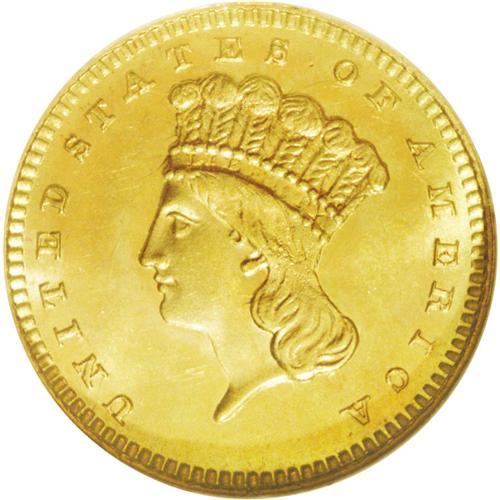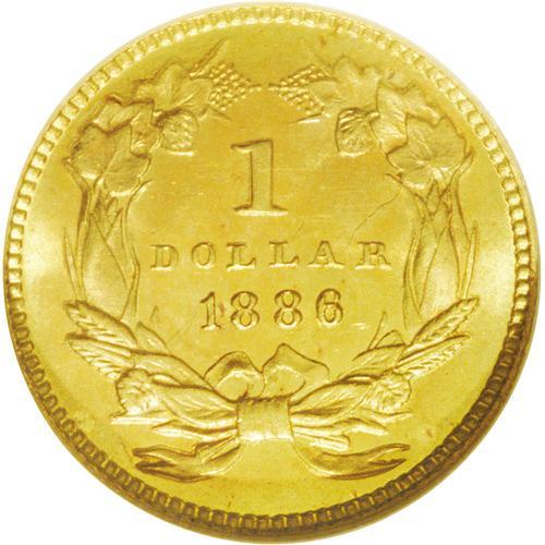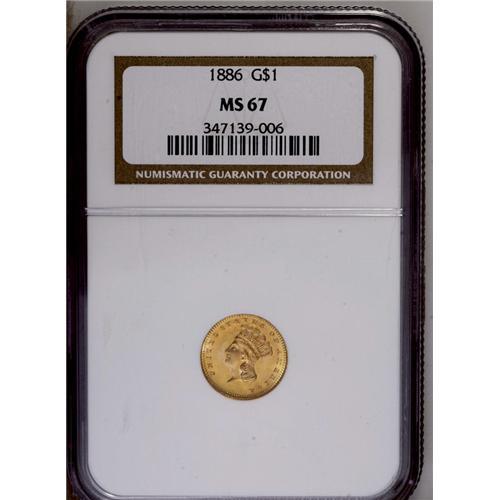 <B>1886<G$1> MS67 NGC.</B></I> The moderate clash marks on this piece--which do not affect the technical grade--are quite interesting. The reverse shows a full, raised, and reversed LIBERTY from the coronet headband on the obverse. Many other mirror-image design elements can be distinguished on each side, abetted by the incredibly pristine surfaces that show almost no distractions of any kind, save for a couple of tiny contact marks on the reverse. This lustrous Superb Gem has bold, even sunset-orange surfaces on both sides. Among the handful of finest graded at either service. Census: 11 in 67, 0 finer (5/06).