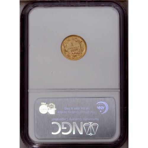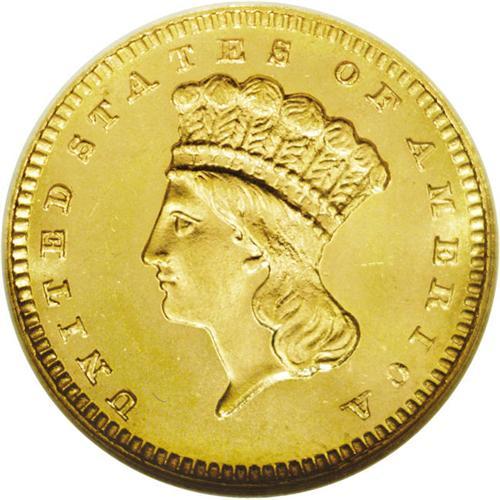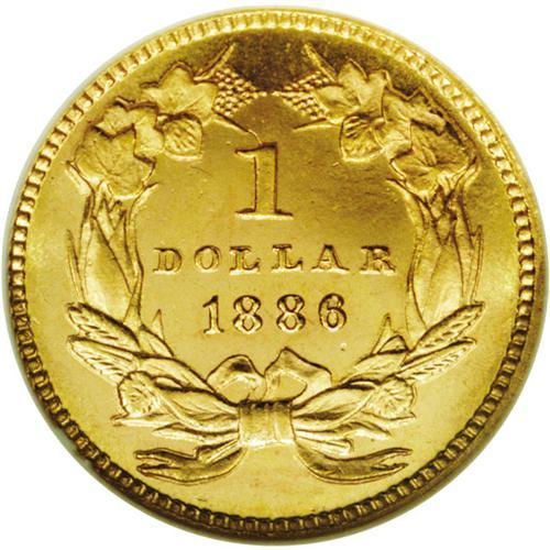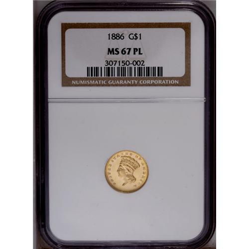 <B>1886<G$1> MS67 Prooflike NGC.</B></I> The 1886 was produced to the extent of just 5,000 circulation strikes and 1,016 proofs. A high quality survivor of the former delivery, this bright yellow-gold Superb Gem displays a pleasing, highly reflective prooflike finish. There are no ill-defined features, and the surfaces are expectantly distraction-free. With the exception of a single coin graded MS67 <img border='0' src='http://www.heritagecoins.com/images/star.gif' width=10 height=10> Deep Prooflike, this example is tied with two others for the finest certified by NGC (2/06).