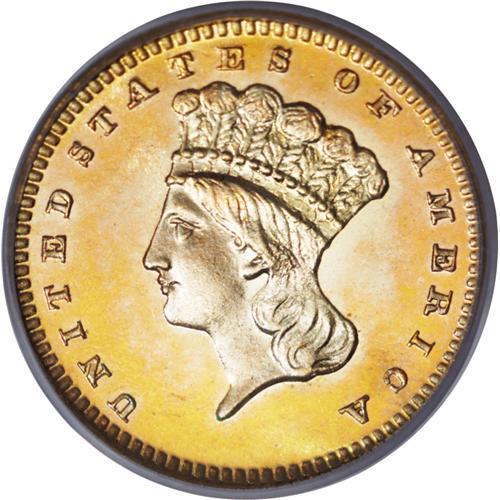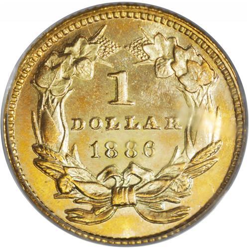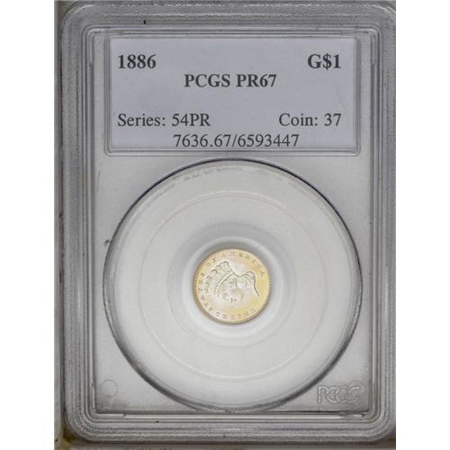 <B>1886<G$1> PR67 PCGS.</B></I> This is a Superb Gem proof with amazing color. Both the obverse and the reverse have rich honey-gold mirrors intermingled with light amber. Extremely sharp with all letters of LIBERTY boldly defined. Some tiny lint marks and other minuscule surface flaws are strictly limited to pre-striking planchet imperfections and do not affect the grade in any manner. Original planchets, even when polished prior to striking proof coins, were far from perfectly smooth. The majority of these tiny surface marks in the planchet were eliminated in the striking process, however, some still remained. In addition, tiny pieces of lint would adhere to the dies when workmen (or workwomen) would wipe the dies with a cloth to remove particles that adhered to the dies during the coinage process. Of course, wiping the dies often left tiny pieces of lint behind, and these small lint remnants would then be transferred to the surface of the finished coin. The finest 1886 gold dollar certified by both of the major grading services (3/06). <BR><BR><B>Important notice:</B> Heritage usually auctions material at the rate of 200-250 lots per hour. On some occasions eBay Live bid software or the Internet may not be able to keep up with the pace of the auction. We recommend placing a realistic absentee bid now as insurance to avoid disappointment. Occasionally the auctioneer may eliminate or reject an eBay Live bid, and the auctioneer may also reopen a lot after the close of the eBay live bidding (usually because we missed an audience bid), and may reject your bid even if it shows you as the winning bidder. By bidding via eBay Live, you agree that Heritage may award the lot to another bidder at its sole discretion under the circumstances described above or any other reasonable circumstances. Since eBay bids are not shown to us until we open the lot on the floor, we treat those bids just like floor bids. In most cases the floor responds before the eBay bid is presented to us, due to Internet lag time, so for consistency we have made it a policy that floor bids are always considered first over tie eBay live bids. Also please note that all Heritage lots purchased through eBay Live carry a 20% Buyer's Premium. Please make sure you read the Terms and Conditions before you bid. This lot is being auctioned in conjunction with a live floor auction by Heritage Galleries & Auctioneers. All final auction and invoice information will be supplied by Heritage Galleries & Auctioneers, and all other information should be considered preliminary. Lot:2335 <BR><BR><B>Winning Notification and Billing:</B> After the FINAL session in this auction is complete, Heritage will send e-mail and snail mail invoices. This process normally takes several days. All final auction and invoice information will be supplied by Heritage Galleries & Auctioneers, and all other information should be considered preliminary. <BR><BR>This auction will be conducted on a live auction floor and over the Internet through eBay Live. If you choose to place an absentee bid, please take a moment to <font color='#0000ff'><u><a href='http://pages.ebay.com/liveauctions/help/before/laabsentee.html'>learn how eBay Live absentee bidding works</a></u></font><font color='#000000'>