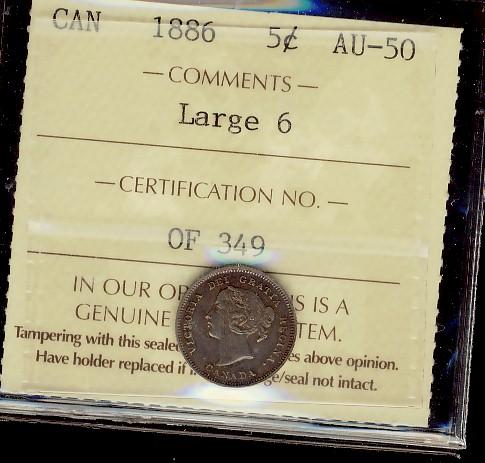 1886 Large 6 5¢ ICCS AU50, lightly toned. Scarce!