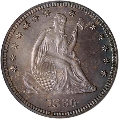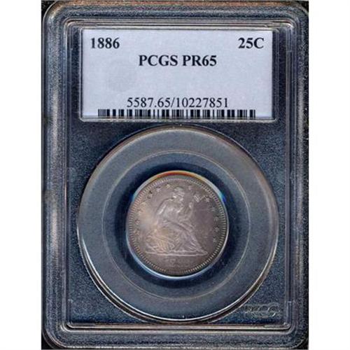 <b>1886 Liberty Seated Quarter Dollar. PCGS graded Proof 65.</b> Devices were struck with energy and full oomph by the dies imparting all design elements boldly. Flowing mint originality like a shimmering waterfall cascades over each side of this Gem. Only 886 Proofs made in 1886 <b>(PCGS # 5587)</b> <i>