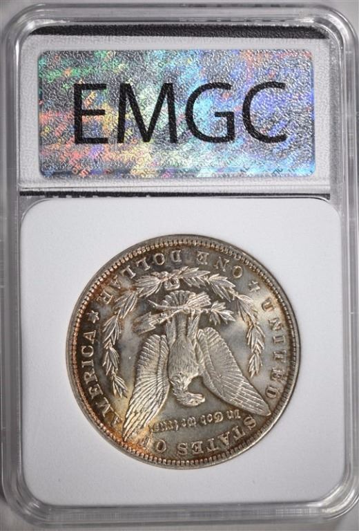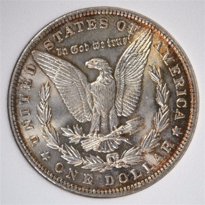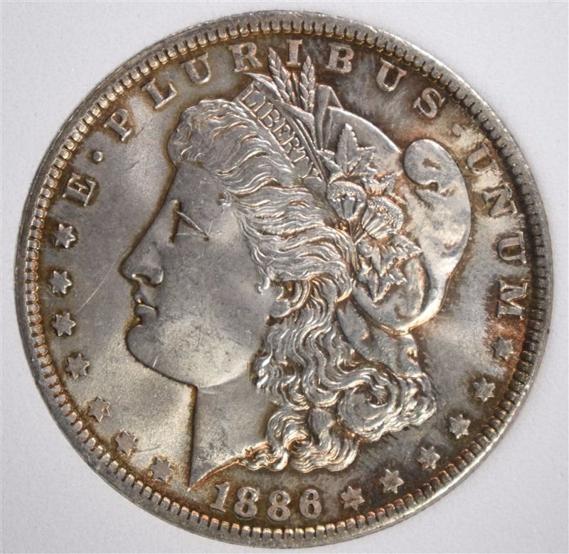 1886 MORGAN SILVER DOLLAR, EMGC SUPERB GEM BU ESTIMATE $195 - $250.