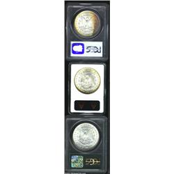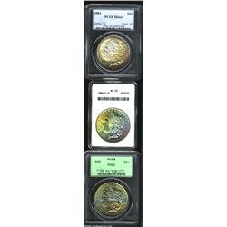 <TABLE cellSpacing=0 cellPadding=0 width="100%" bgColor=#000000 border=0><TBODY><TR><TD width="100%"><TABLE cellSpacing=1 cellPadding=3 width="100%" border=0><TBODY><TR><TD width="100%" bgColor=#79735c><FONT face=arial color=#ffffff size=3><B>Description</B> </FONT></TD></TR><TR><TD width="100%" bgColor=#ffffff><FONT face=arial size=2><B>1883 $1 MS64 PCGS,</B></I> powder-blue, gold, and ruby-red colors frame the centers, struck from a lightly rusted die; <B>1884-O MS63 ANACS,</B></I> gold, sky-blue, and orange patina endows the obverse, the cheek has a few luster grazes; and an <B>1886 MS64 PCGS,</B></I> lemon and electric-blue patina consumes the obverse, the reverse is brilliant, a well preserved near-Gem. (3 coins) </FONT></TD></TR></TBODY></TABLE></TD></TR></TBODY></TABLE><BR><A name=PricesRealized></A><TABLE cellSpacing=0 cellPadding=0 width="100%" bgColor=#000000 border=0><TBODY><TR><TD width="100%"><TABLE cellSpacing=1 cellPadding=3 width="100%" border=0><TBODY><TR><TD width="100%" bgColor=#79735c><A name=PR><FONT face=arial color=#ffffff size=3><B>Previous Prices from Heritage Auctions</B> </FONT></A></TD></TR><TR><TD bgColor=#f6f6ed><TABLE cellSpacing=0 cellPadding=0 width="100%" border=1><TBODY><TR><TD align=middle width="33%"><B>Date</B></TD><TD align=middle width="33%"><B>Service</B></TD><TD align=middle width="33%"><B>Price</B></TD></TR><TR bgColor=whitesmoke><TD width="33%"><B>10/07/2001</B></TD><TD width="33%">NGC</TD><TD width="33%">$87.40</TD></TR><TR bgColor=whitesmoke><TD width="33%"><B>09/25/2001</B></TD><TD width="33%">NGC</TD><TD width="33%">$43.00</TD></TR><TR bgColor=whitesmoke><TD width="33%"><B>04/03/2001</B></TD><TD width="33%">NGC</TD><TD width="33%">$45.00</TD></TR><TR bgColor=whitesmoke><TD width="33%"><B>12/19/2000</B></TD><TD width="33%">NGC</TD><TD width="33%">$35.00</TD></TR><TR bgColor=whitesmoke><TD width="33%"><B>02/08/2000</B></TD><TD width="33%">NGC</TD><TD width="33%">$40.00</TD></TR><TR bgColor=whitesmoke><TD width="33%"><B>02/12/2000</B></TD><TD width="33%">NGC</TD><TD width="33%">$46.00</TD></TR><TR bgColor=whitesmoke><TD width="33%"><B>11/21/2000</B></TD><TD width="33%">NGC</TD><TD width="33%">$38.00</TD></TR><TR bgColor=whitesmoke><TD width="33%"><B>10/08/1994</B></TD><TD width="33%">NGC</TD><TD width="33%">$121.00</TD></TR><TR bgColor=whitesmoke><TD width="33%"><B>10/08/1994</B></TD><TD width="33%">NGC</TD><TD width="33%">$33.00</TD></TR><TR bgColor=whitesmoke><TD width="33%"><B>11/17/1995</B></TD><TD width="33%">NGC</TD><TD width="33%">$38.50</TD></TR><TR bgColor=whitesmoke><TD width="33%"><B>07/11/2000</B></TD><TD width="33%">NGC</TD><TD width="33%">$70.00</TD></TR><TR bgColor=whitesmoke><TD width="33%"><B>02/29/2000</B></TD><TD width="33%">NGC</TD><TD width="33%">$40.00</TD></TR><TR bgColor=whitesmoke><TD width="33%"><B>09/17/2002</B></TD><TD width="33%">ANACS</TD><TD width="33%">$33.35</TD></TR><TR bgColor=whitesmoke><TD width="33%"><B>11/26/2002</B></TD><TD width="33%">PCGS</TD><TD width="33%">$40.25</TD></TR><TR bgColor=whitesmoke><TD width="33%"><B>06/02/2003</B></TD><TD width="33%">NGC</TD><TD width="33%">$120.75</TD></TR><TR bgColor=whitesmoke><TD width="33%"><B>07/22/2003</B></TD><TD width="33%">PCGS</TD><TD width="33%">$41.40</TD></TR><TR bgColor=whitesmoke><TD width="33%"><B>01/11/2003</B></TD><TD width="33%">PCGS</TD><TD width="33%">$287.50</TD></TR><TR bgColor=whitesmoke><TD width="33%"><B>11/12/2002</B></TD><TD width="33%">PCGS</TD><TD width="33%">$47.15</TD></TR><TR bgColor=whitesmoke><TD width="33%"><B>09/24/2002</B></TD><TD width="33%">PCGS</TD><TD width="33%">$35.65</TD></TR><TR bgColor=whitesmoke><TD width="33%"><B>04/16/2002</B></TD><TD width="33%">PCGS</TD><TD width="33%">$37.95</TD></TR><TR bgColor=whitesmoke><TD width="33%"><B>03/05/2002</B></TD><TD width="33%">PCGS</TD><TD width="33%">$50.60</TD></TR><TR bgColor=whitesmoke><TD width="33%"><B>06/02/2001</B></TD><TD width="33%">PCGS</TD><TD width="33%">$51.75</TD></TR><TR bgColor=whitesmoke><TD width="33%"><B>12/26/2000</B></TD><TD width="33%">PCGS</TD><TD width="33%">$35.00</TD></TR><TR bgColor=whitesmoke><TD width="33%"><B>12/19/2000</B></TD><TD width="33%">PCGS</TD><TD width="33%">$46.00</TD></TR><TR bgColor=whitesmoke><TD width="33%"><B>07/11/2000</B></TD><TD width="33%">PCGS</TD><TD width="33%">$40.00</TD></TR><TR bgColor=whitesmoke><TD width="33%"><B>07/04/2000</B></TD><TD width="33%">PCGS</TD><TD width="33%">$60.00</TD></TR><TR bgColor=whitesmoke><TD width="33%"><B>10/24/2000</B></TD><TD width="33%">PCGS</TD><TD width="33%">$40.00</TD></TR><TR bgColor=whitesmoke><TD width="33%"><B>04/18/2000</B></TD><TD width="33%">PCGS</TD><TD width="33%">$45.00</TD></TR><TR bgColor=whitesmoke><TD width="33%"><B>08/14/1999</B></TD><TD width="33%">PCGS</TD><TD width="33%">$74.75</TD></TR><TR bgColor=whitesmoke><TD width="33%"><B>01/06/1996</B></TD><TD width="33%">PCGS</TD><TD width="33%">$77.00</TD></TR><TR bgColor=whitesmoke><TD width="33%"><B>06/04/1999</B></TD><TD width="33%">PCGS</TD><TD width="33%">$51.75</TD></TR><TR bgColor=whitesmoke><TD width="33%"><B>06/06/2000</B></TD><TD width="33%">PCGS</TD><TD width="33%">$70.00</TD></TR><TR bgColor=whitesmoke><TD width="33%"><B>05/16/2000</B></TD><TD width="33%">PCGS</TD><TD width="33%">$50.00</TD></TR><TR bgColor=whitesmoke><TD width="33%"><B>06/05/2001</B></TD><TD width="33%">PCGS</TD><TD width="33%">$45.00</TD></TR><TR bgColor=whitesmoke><TD width="33%"><B>06/19/2001</B></TD><TD width="33%">PCGS</TD><TD width="33%">$43.00</TD></TR><TR bgColor=whitesmoke><TD width="33%"><B>06/02/2001</B></TD><TD width="33%">PCGS</TD><TD width="33%">$32.20</TD></TR><TR bgColor=whitesmoke><TD width="33%"><B>06/02/2001</B></TD><TD width="33%">PCGS</TD><TD width="33%">$40.25</TD></TR><TR bgColor=whitesmoke><TD width="33%"><B>10/31/2000</B></TD><TD width="33%">ANACS</TD><TD width="33%">$46.00</TD></TR><TR bgColor=whitesmoke><TD width="33%"><B>07/22/2003</B></TD><TD width="33%">NGC</TD><TD width="33%">$86.25</TD></TR></TBODY></TABLE></TD></TR><TR><TD b
