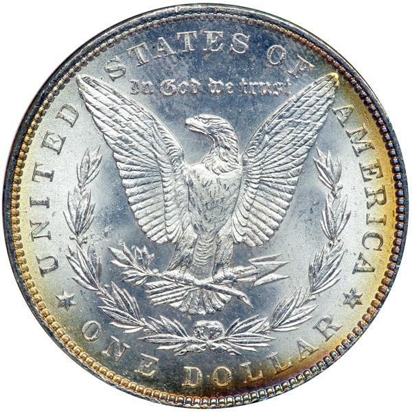 1886 Morgan Dollar. NGC graded MS-63. Star. CAC Approved. Lovely obverse green and lilac toning. This is a sparkling specimen radiating mint bloom, carefully struck and exquisitely toned (PCGS # 7166) .