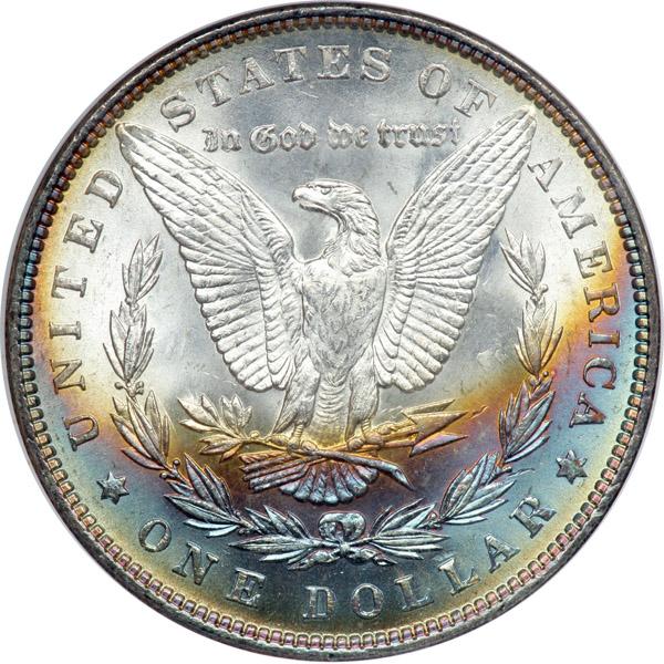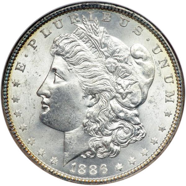 1886 Morgan Dollar. NGC graded MS-64*. The obverse is blast white while the reverse exhibits an arc of vivid rainbow colors (PCGS # 7166) .