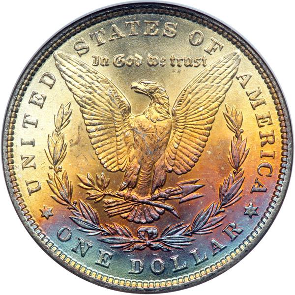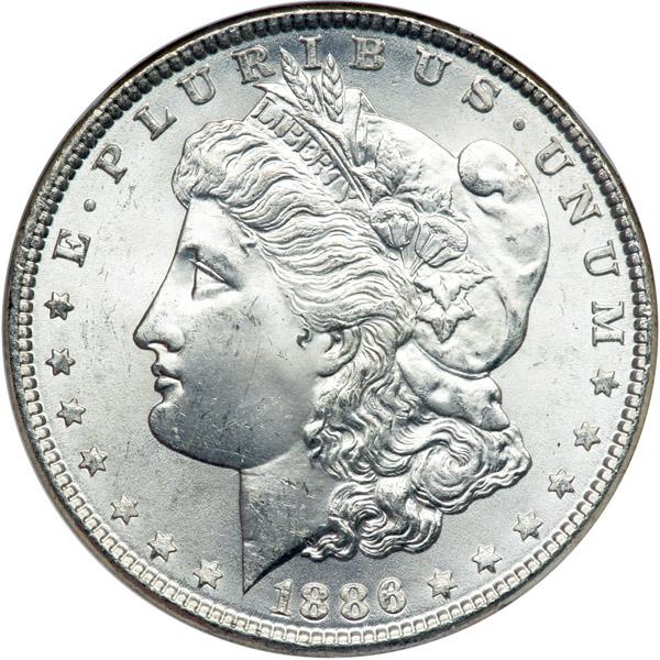 1886 Morgan Dollar. NGC graded MS-65*. Impressive multi-faceted shades blanket the reverse surfaces (PCGS # 7166) .