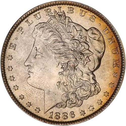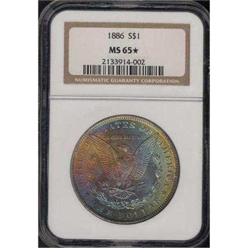 <b>1886 Morgan Dollar. NGC graded MS65 Star Designation for Eye Appeal.</b> This time it is the reverse that is toned, and what a marvelous combination of hues, iridescence, and vibrancy! As you can see in the color photographs, the shades include gold with lavender or magenta, plus various tints of blue or blue-green. And all original! <b>(PCGS # 7166)</b>
