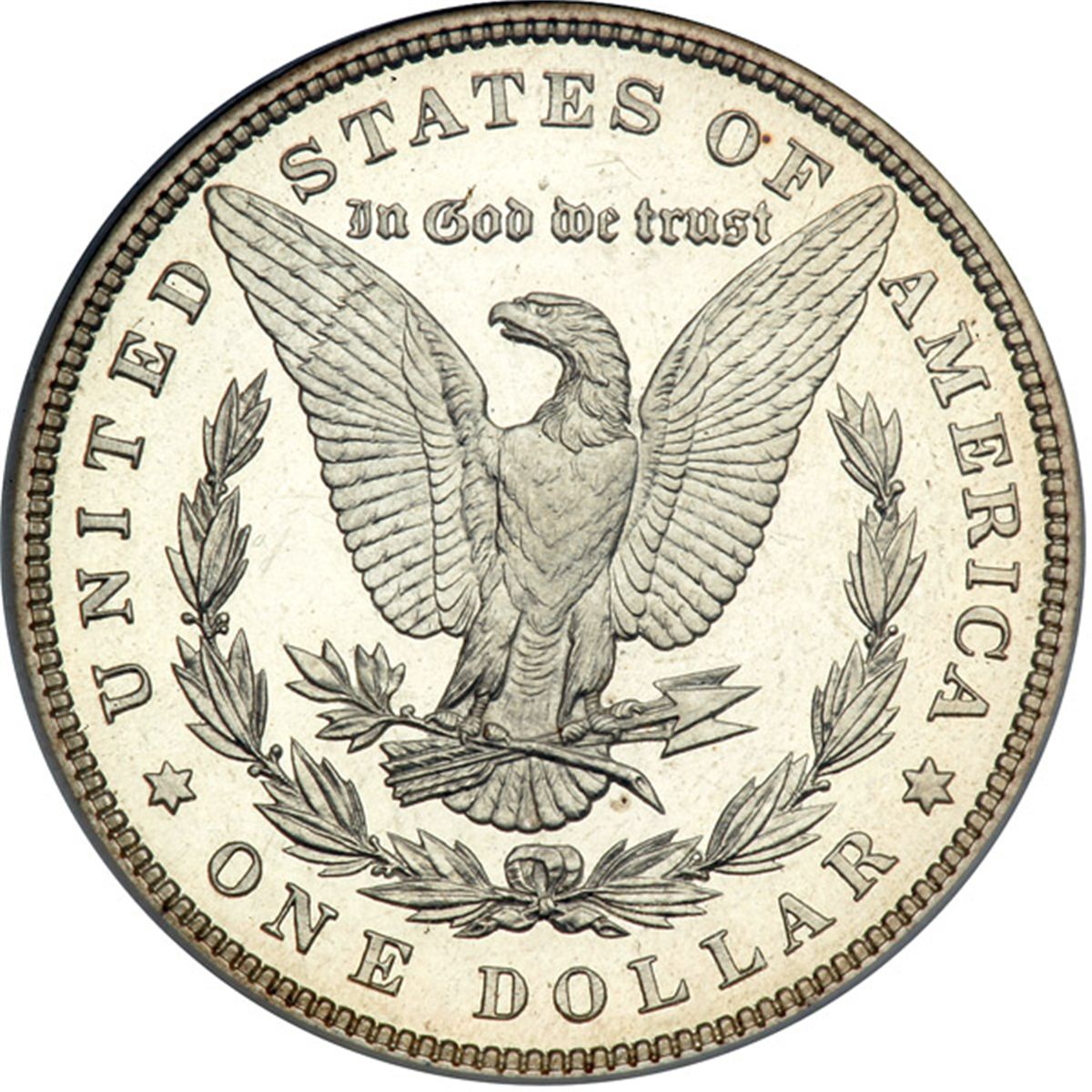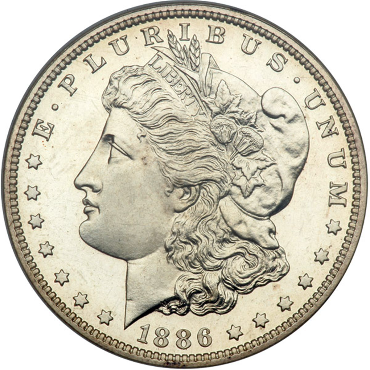 1886 Morgan Dollar. NGC graded Proof 65. A fully white Gem Proof. Delicate satin to frosted white devices resonate off of the mirror surface of this near-pristine Gem. In former days, the luster was enough to determine a coin's status. But today, just as important is the strike: there is no deviation in the sharp relief seen, not even in the centers of the coin. Only 886 Proofs struck. (PCGS # 7321) .