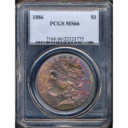 <b>1886 Morgan Dollar. PCGS graded MS66.</b> Exquisite luster, color, surfaces, strike -- an ideal combination of virtues that the established collector will recognize immediately <b>(PCGS # 7166)</b>