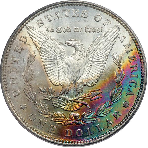 1886 Morgan Dollar. PCGS graded MS-64. An arc of rainbow tone stretches across the reverse (PCGS # 7166) .