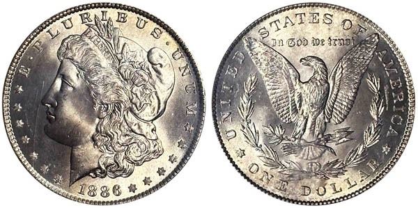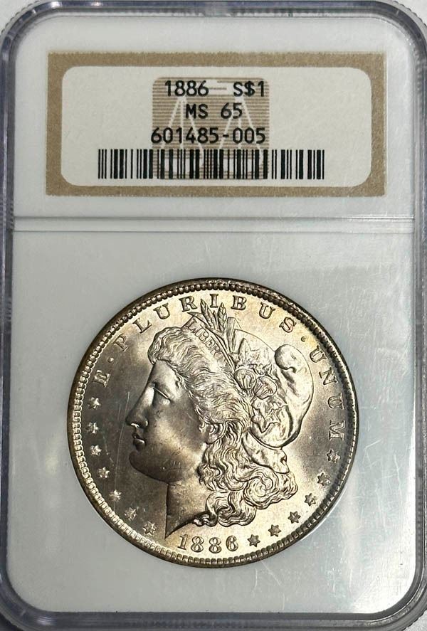 1886 Morgan Dollar. NGC graded MS-65. Greysheet $175, CPG $228.