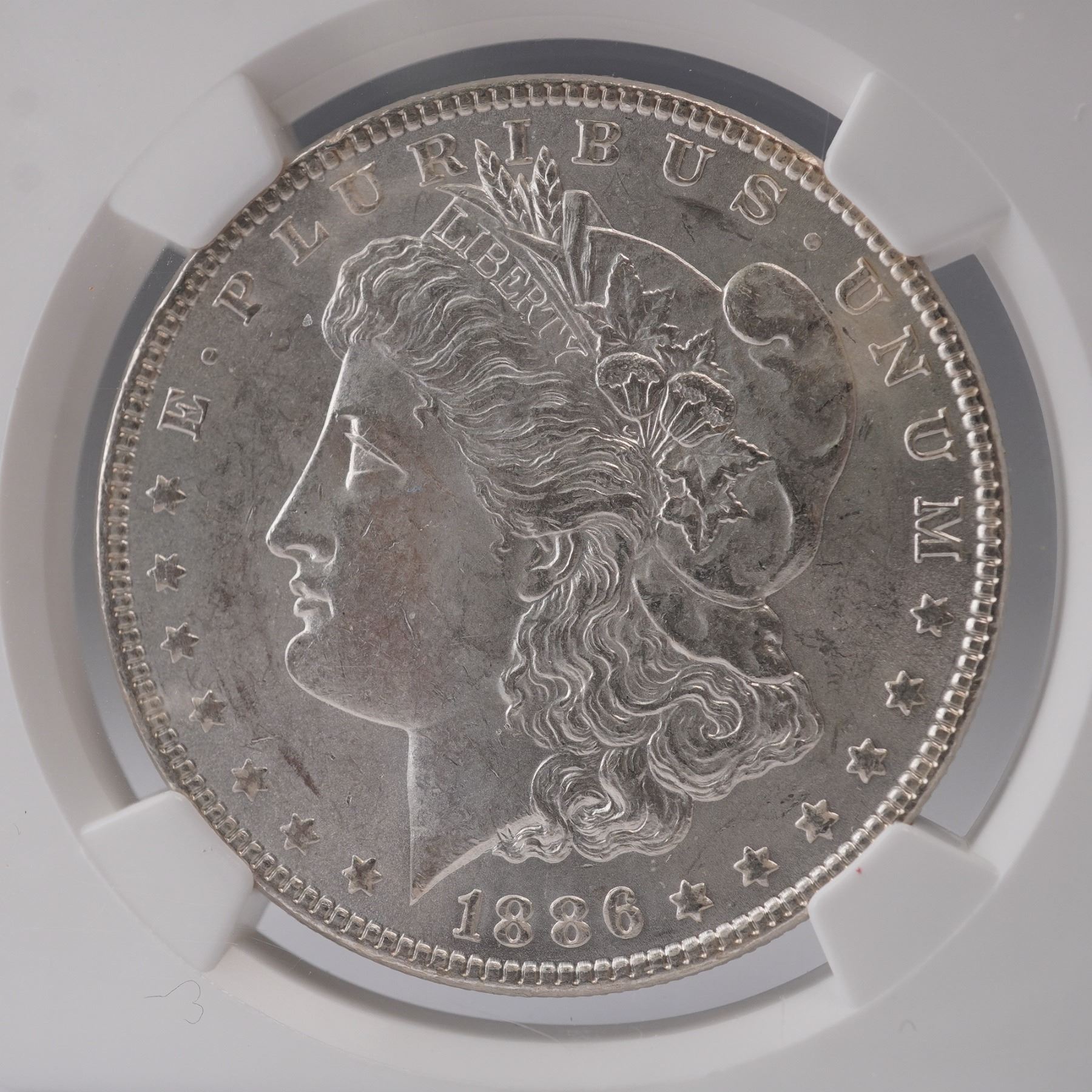 United States 1886 Morgan Silver Dollar graded Mint State 62 by the Numismatic Guaranty Corporation (NGC). The obverse of the coin features the classic profile portrait of Lady Liberty facing left, adorned with a Phrygian cap inscribed with the word LIBERTY on a ribbon. The design includes detailed elements such as two cotton blossoms and two heads of wheat, symbolizing American agriculture. Surrounding Liberty's profile are thirteen stars representing the original colonies, along with the inscription E PLURIBUS UNUM and the year 1886. The reverse depicts a heraldic eagle with outstretched wings clutching a bundle of arrows and an olive branch, representing readiness for war and a desire for peace. The eagle is surrounded by a laurel wreath and flanked by stars. The inscriptions read UNITED STATES OF AMERICA and ONE DOLLAR, with the motto IN GOD WE TRUST inscribed above the eagle's head. This silver dollar is encapsulated in a protective NGC holder bearing the official certification label, barcode, and NGC hologram. Slab: 2.25"L x 0.5"W x 3.25"H. Coin diameter: 38.1mm.