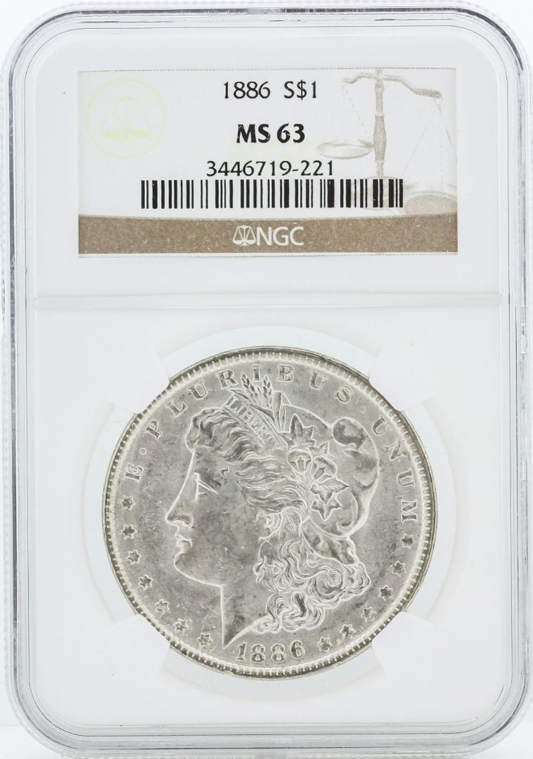 One 1886 NGC MS63 Morgan Silver Dollar.