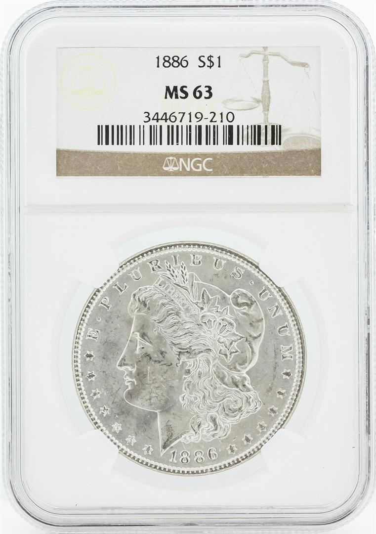 One 1886 NGC MS63 Morgan Silver Dollar.