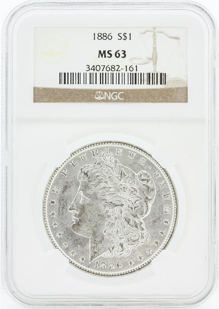 One 1886 NGC MS63 Morgan Silver Dollar.