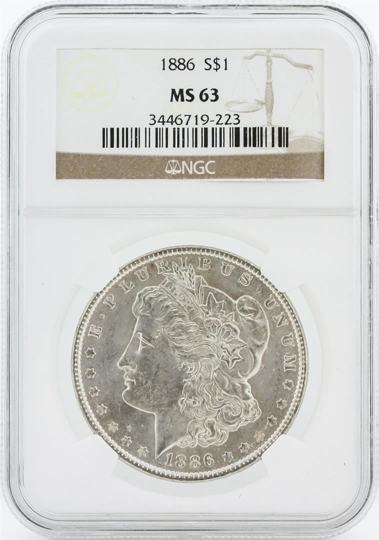 One 1886 NGC MS63 Morgan Silver Dollar.