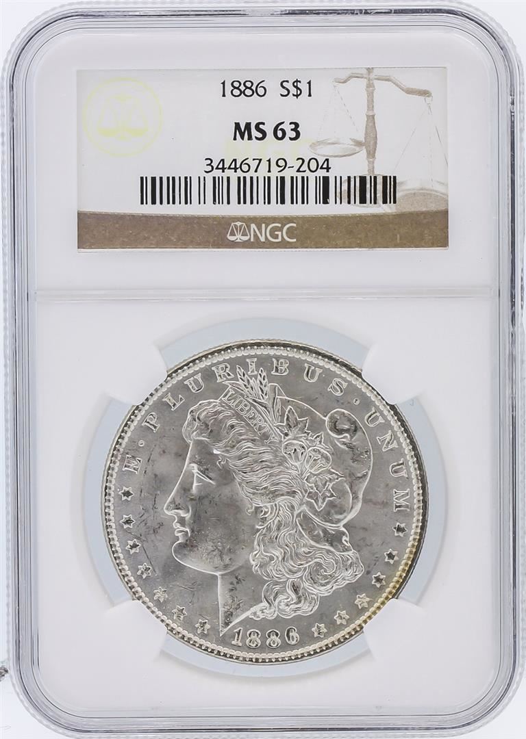 One 1886 NGC MS63 Morgan Silver Dollar.