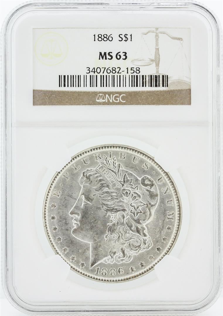 One 1886 NGC MS63 Morgan Silver Dollar.