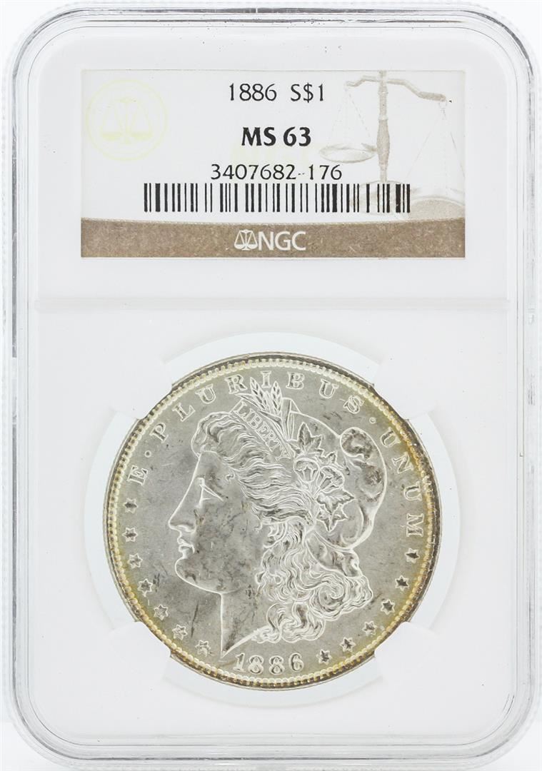 One 1886 NGC MS63 Morgan Silver Dollar.