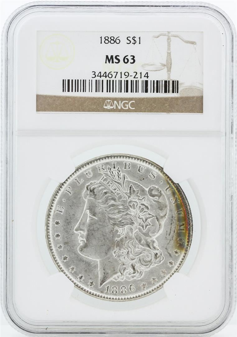 One 1886 NGC MS63 Morgan Silver Dollar.