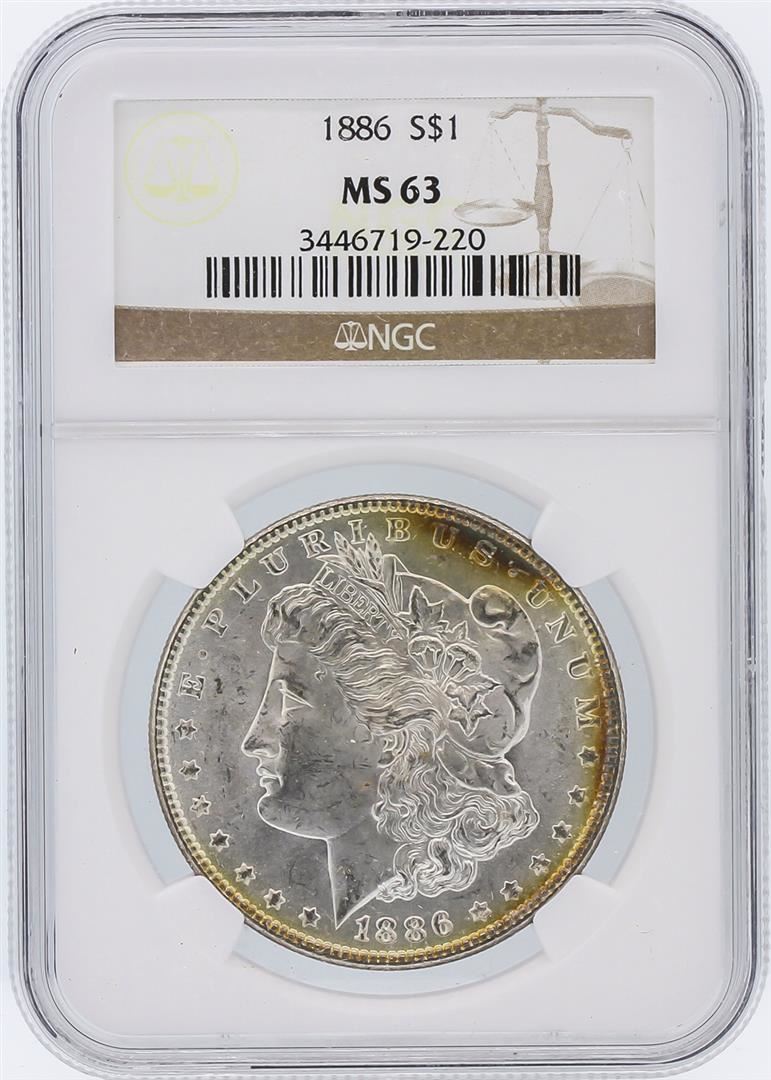 One 1886 NGC MS63 Morgan Silver Dollar.
