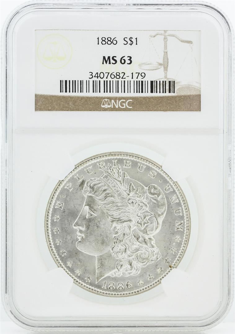 One 1886 NGC MS63 Morgan Silver Dollar.
