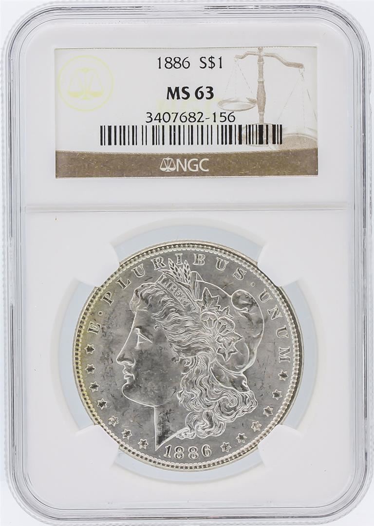 One 1886 NGC MS63 Morgan Silver Dollar.