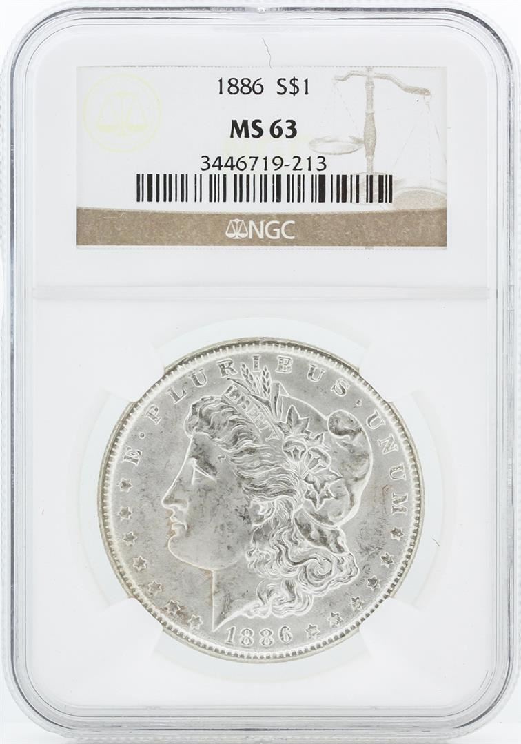 One 1886 NGC MS63 Morgan Silver Dollar.
