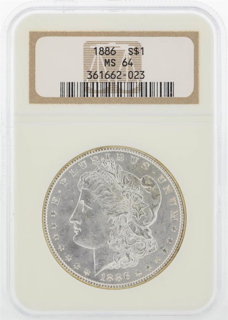 One 1886 NGC MS64 Morgan Silver Dollar.
