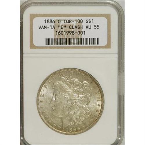<B>1886-O $1 "E" Clash AU55 NGC.</B></I> Vam-1A. A Top 100 variety. NGC Census: (484/2125). PCGS Population (436/2246). Mintage: 10,710,000. Numismedia Wsl. Price for NGC/PCGS coin in AU55: $160. (#7168)<BR><BR><B>Coin Engraver:</B> George T. Morgan<BR><BR><b>Shipping:</b> Coins & Currency (<a target="_blank" href="http://www.heritageauctions.com/common/shipping.php">view shipping information</a>)