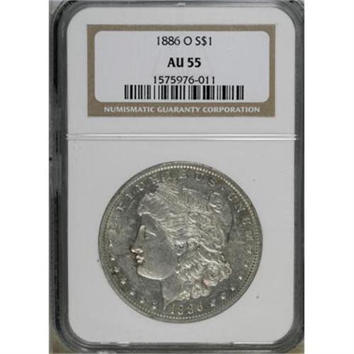 <B>1886-O $1 AU55 NGC.</B></I> NGC Census: (516/2274). PCGS Population (455/2448). Mintage: 10,710,000. Numismedia Wsl. Price for NGC/PCGS coin in AU55: $160. (#7168)<BR><BR><B>Coin Engraver:</B> George T. Morgan<BR><BR><b>Shipping:</b> Coins & Currency (<a target="_blank" href="http://www.heritageauctions.com/common/shipping.php">view shipping information</a>)