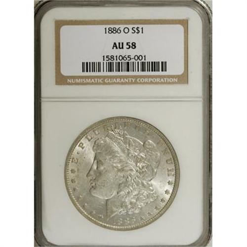 <B>1886-O $1 AU58 NGC.</B></I> NGC Census: (916/1225). PCGS Population (614/1636). Mintage: 10,710,000. Numismedia Wsl. Price for NGC/PCGS coin in AU58: $200. (#7168)<BR><BR><B>Coin Engraver:</B> George T. Morgan<BR><BR><b>Shipping:</b> Coins & Currency (<a target="_blank" href="http://www.heritageauctions.com/common/shipping.php">view shipping information</a>)